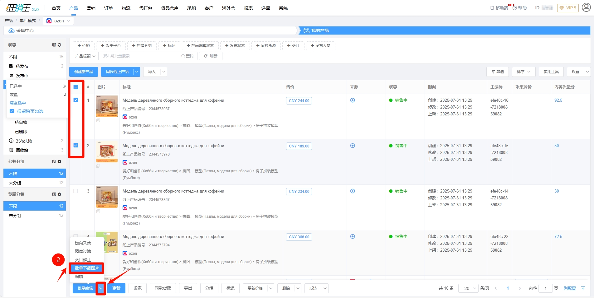 第二步:【勾选需要批量下载图片的产品——点击批量编辑旁的箭头——点击批量下载图片】