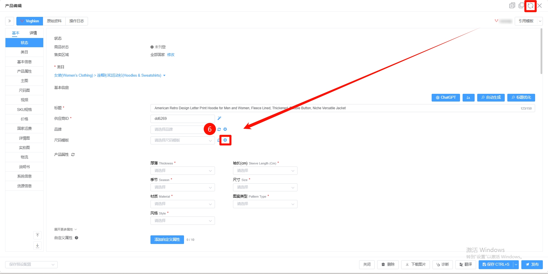 第六步:进入产品编辑界面点击刷新,同步新增的尺码表