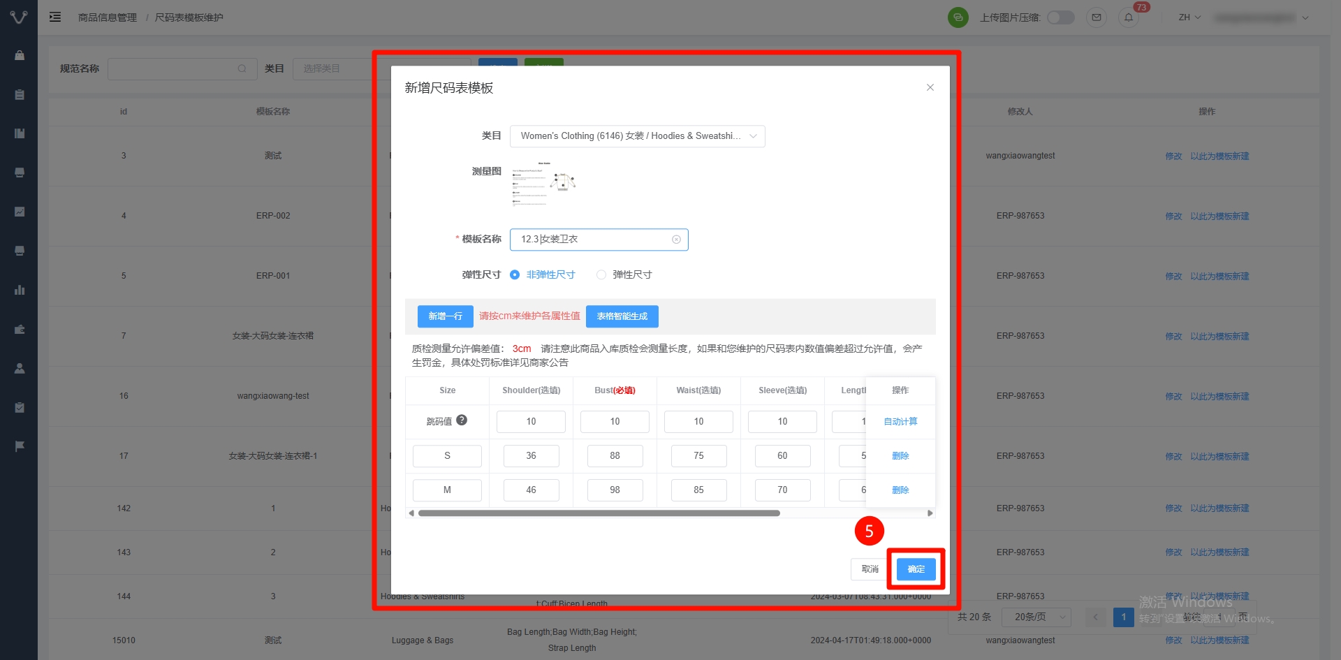 第七步:点击尺码表栏旁 螺丝标识 -> 点击新增 -> 选择对应尺码表 -> 点击保存