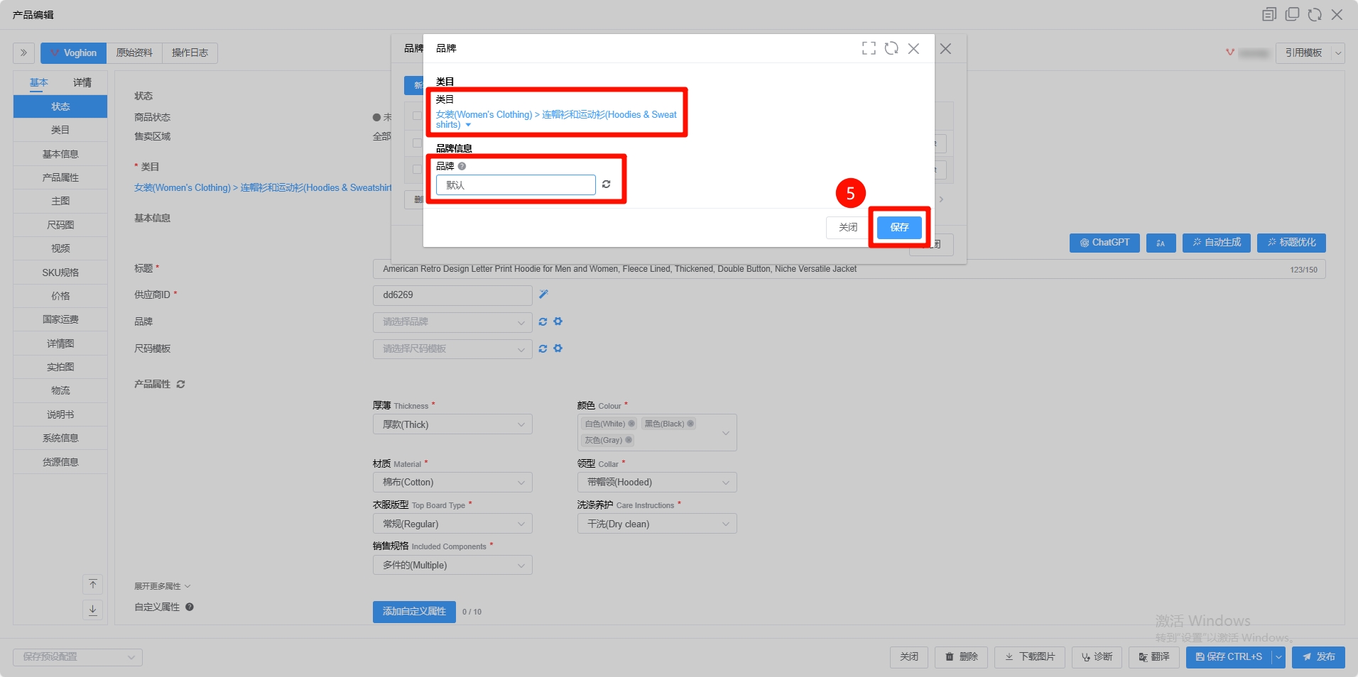 第五步:填写产品对应类目及品牌 -> 点击保存