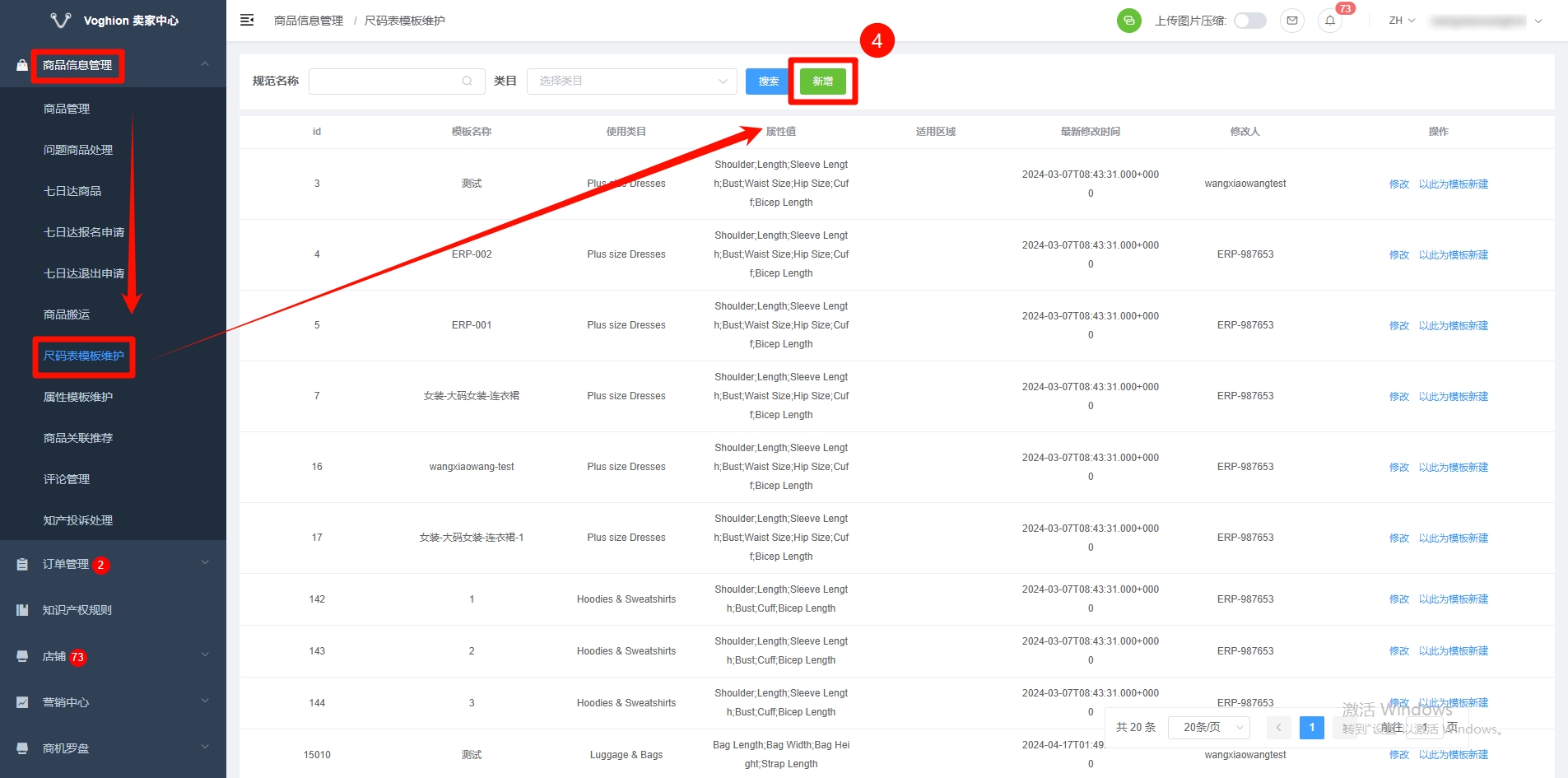 第四步:进入Voghion卖家中心 -> 进入商品信息管理 -> 点击尺码表模板维护 -> 点击新增