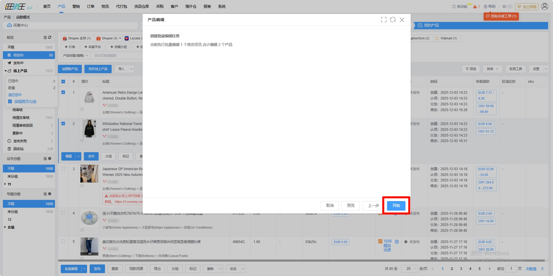 选择需要批量编辑的产品 -> 点击批量编辑 -> 点击品牌 -> 选择对应品牌-> 点击下一步