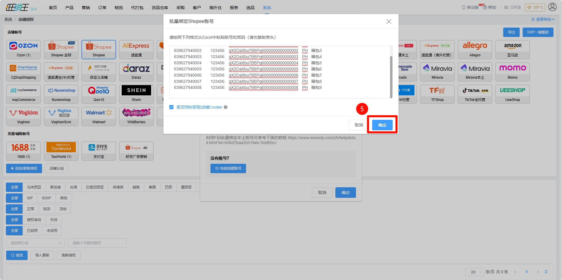 第五步:将对应信息进行复制黏贴 -> 点击右下角确定,即可完成批量授权Shopee店铺。