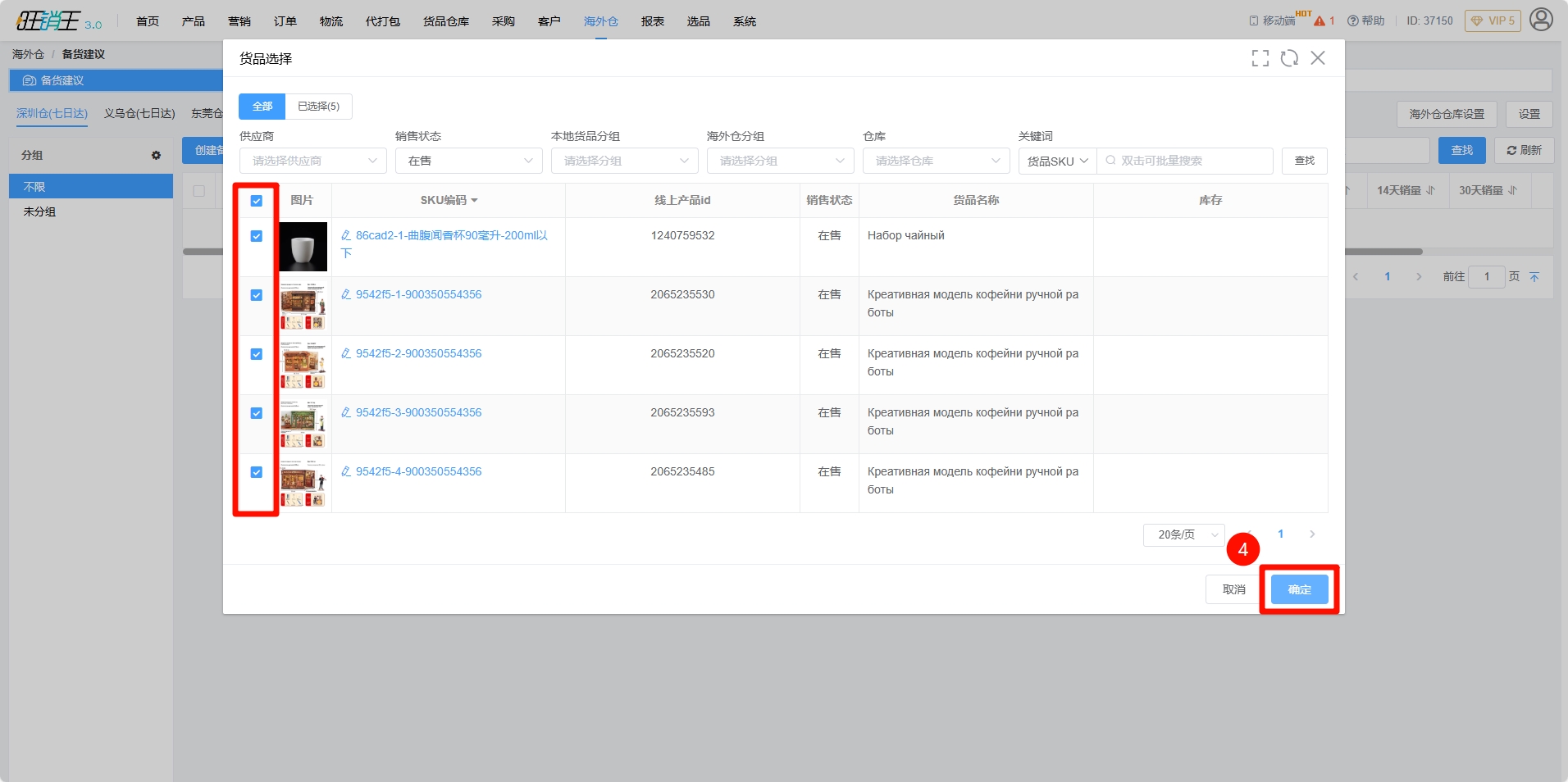 第四步:选择需要在海外仓进行备货的货品 -> 点击确定