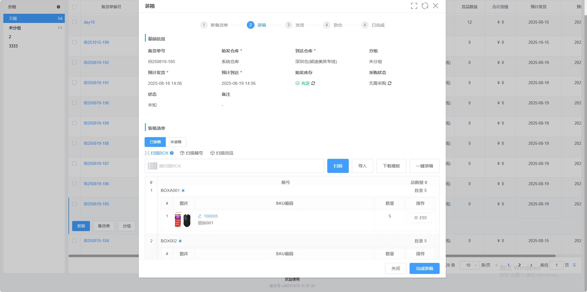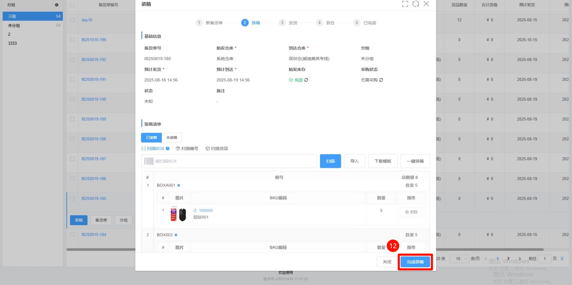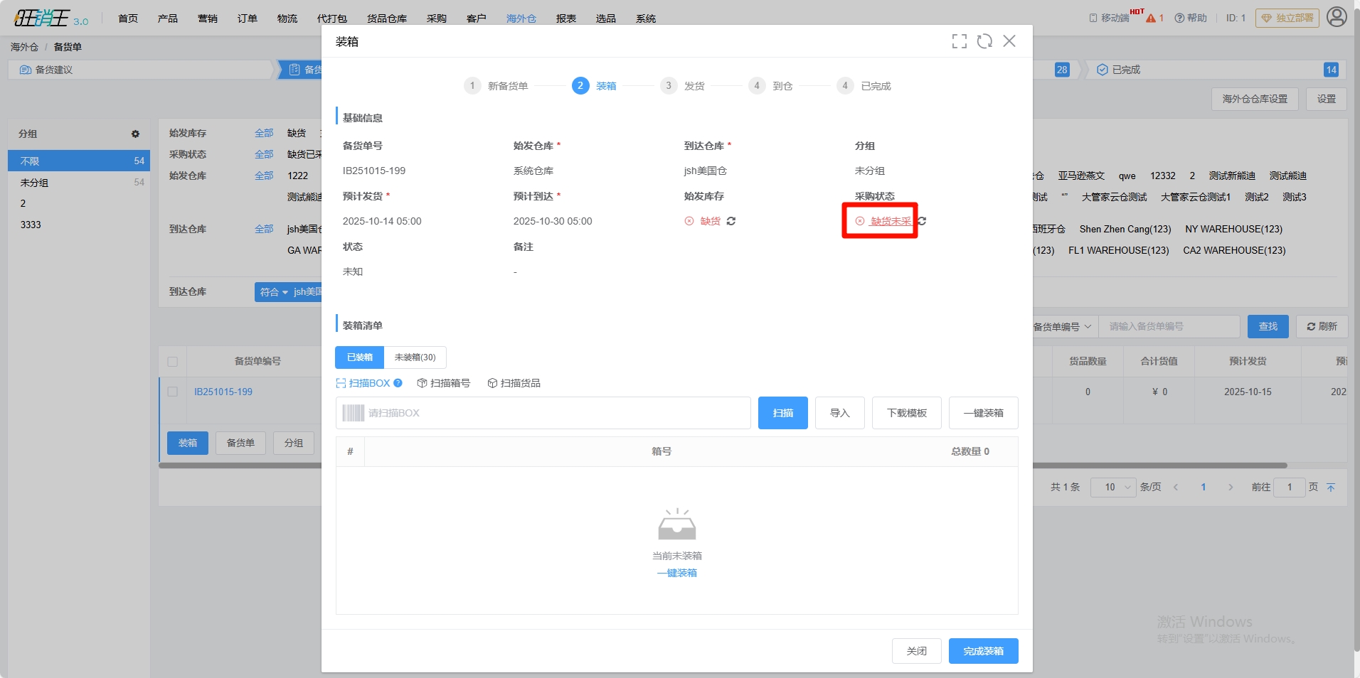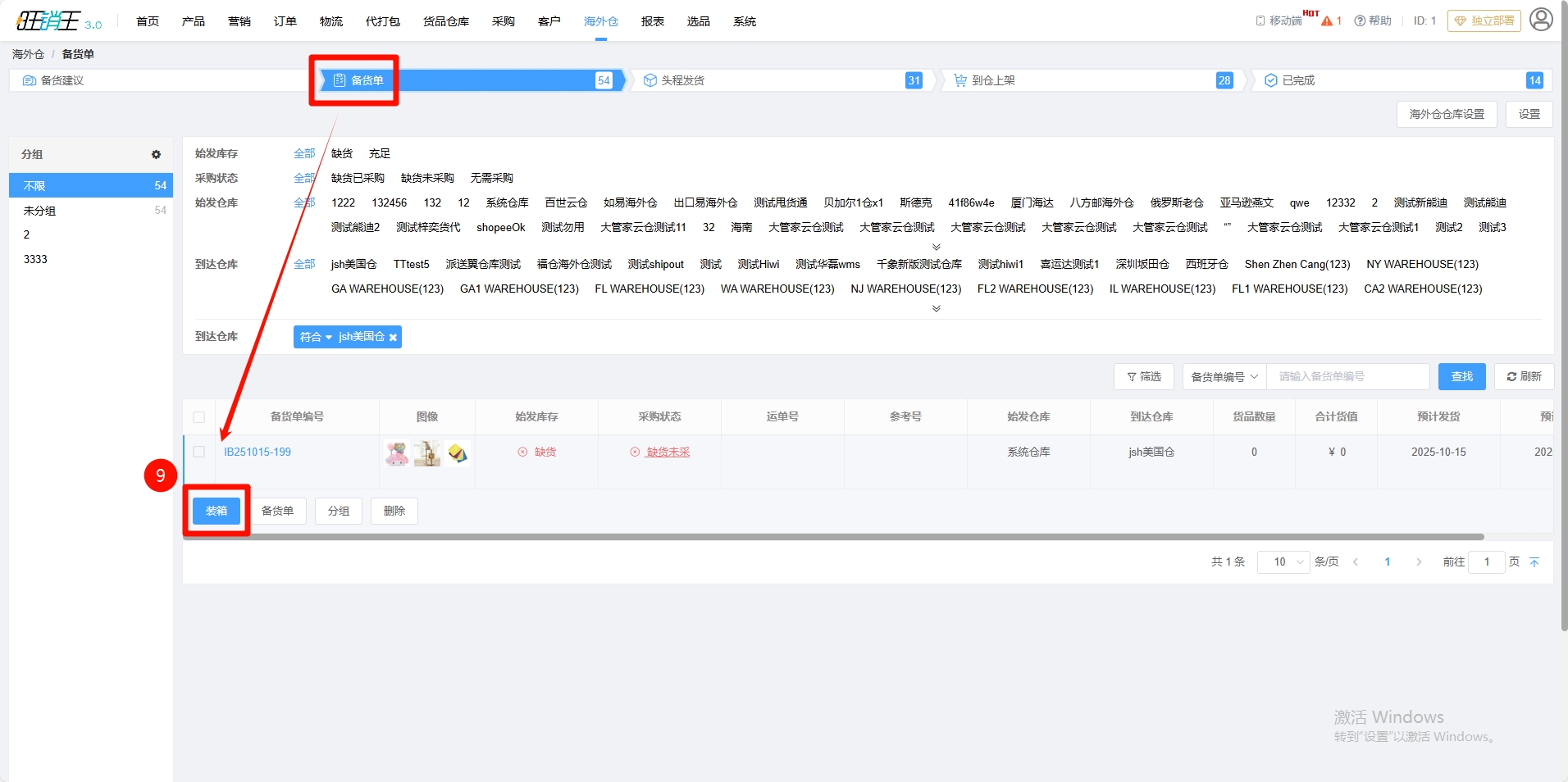 第九步:在上方点击备货单 -> 找到对应备货单 -> 点击装箱
