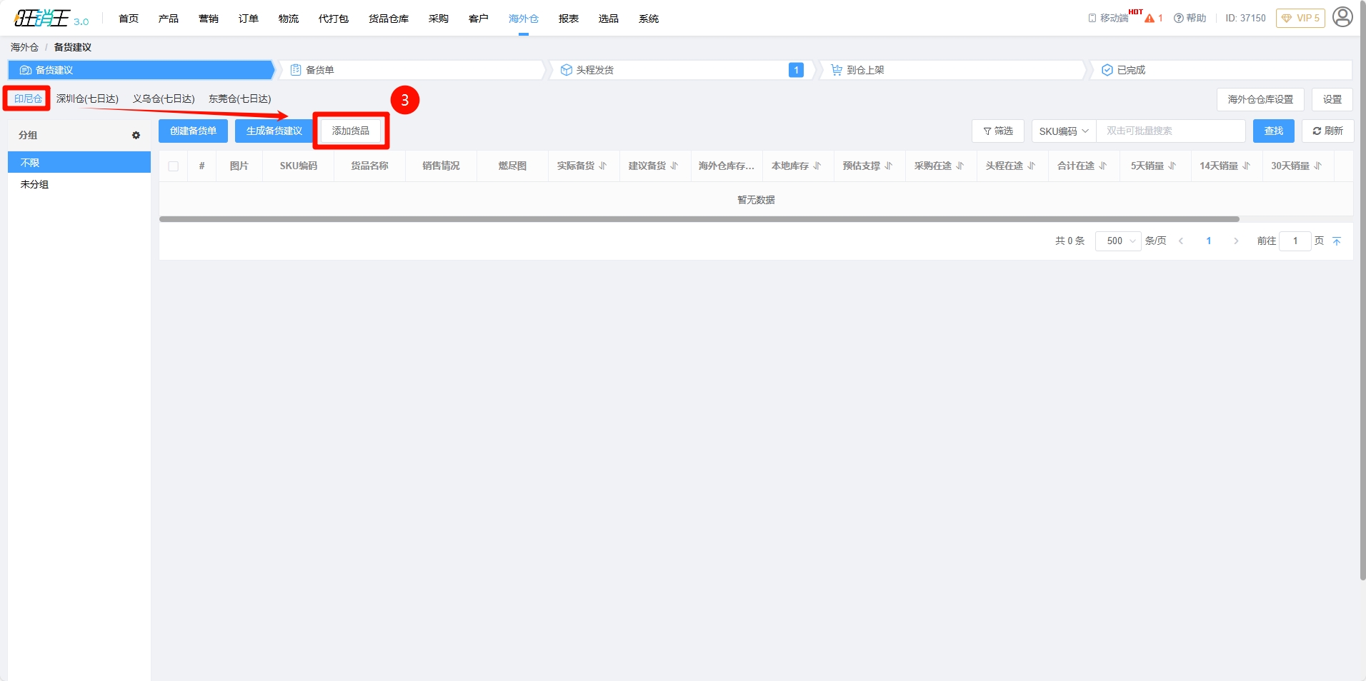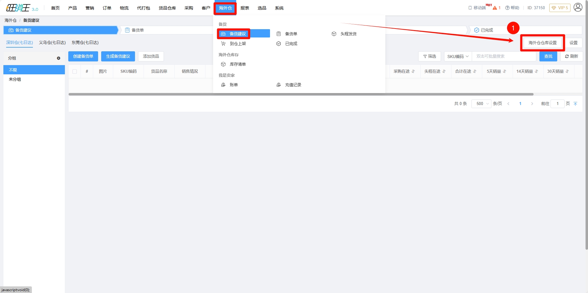 第一步:点击海外仓 -> 进入备货建议 -> 点击海外仓仓库设置