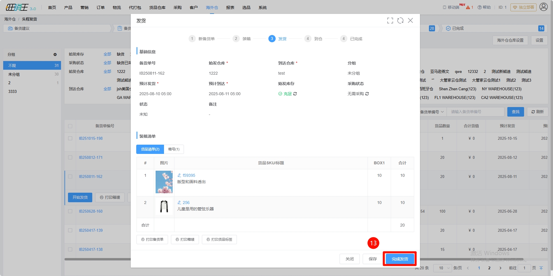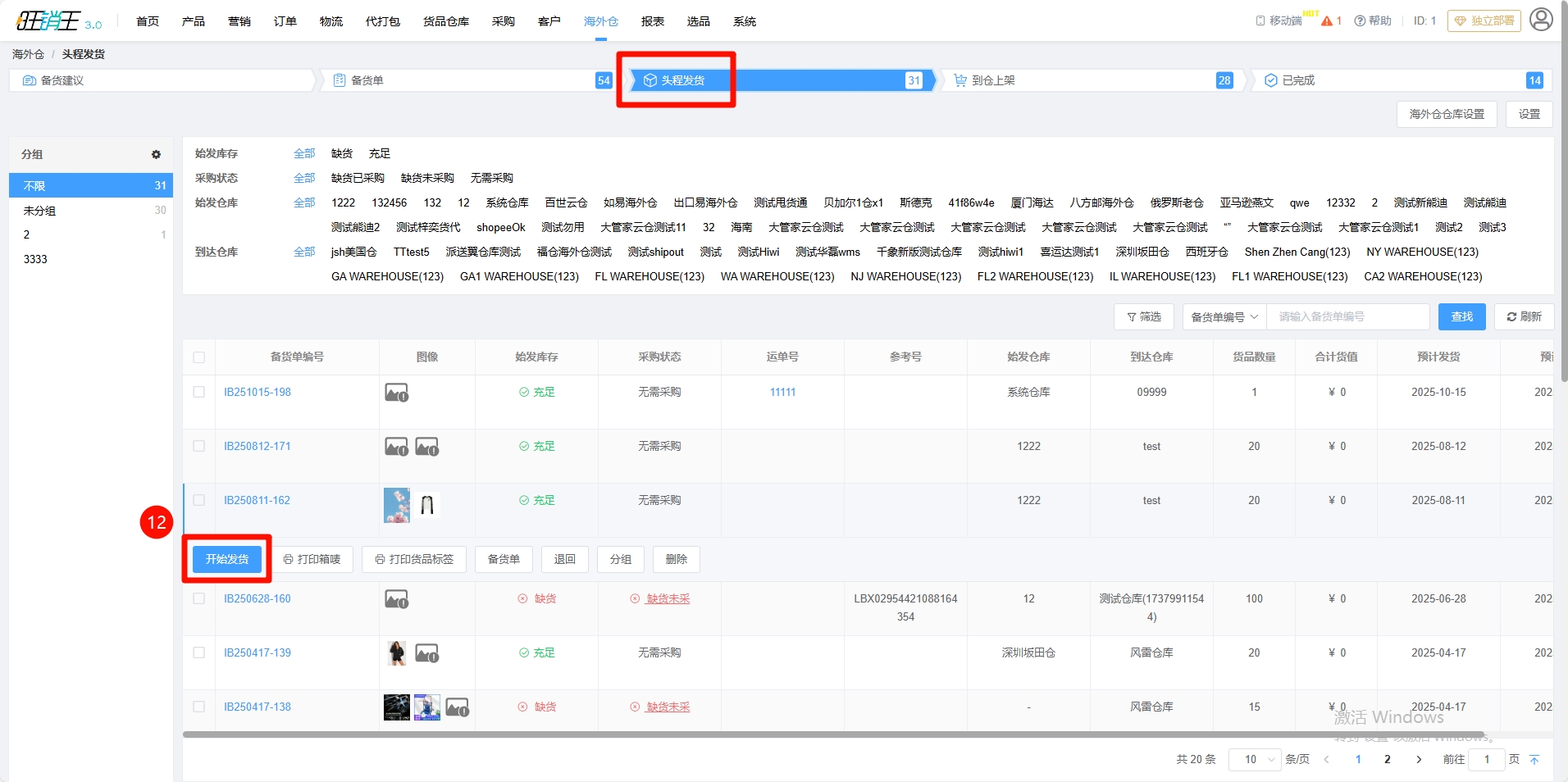 第十二步:该备货单将进入头程发货阶段,选择对应货品并点击开始发货。