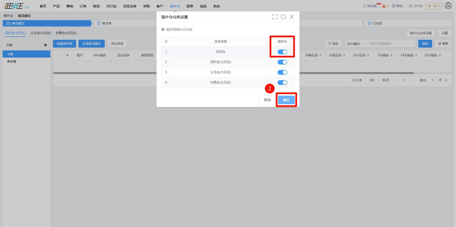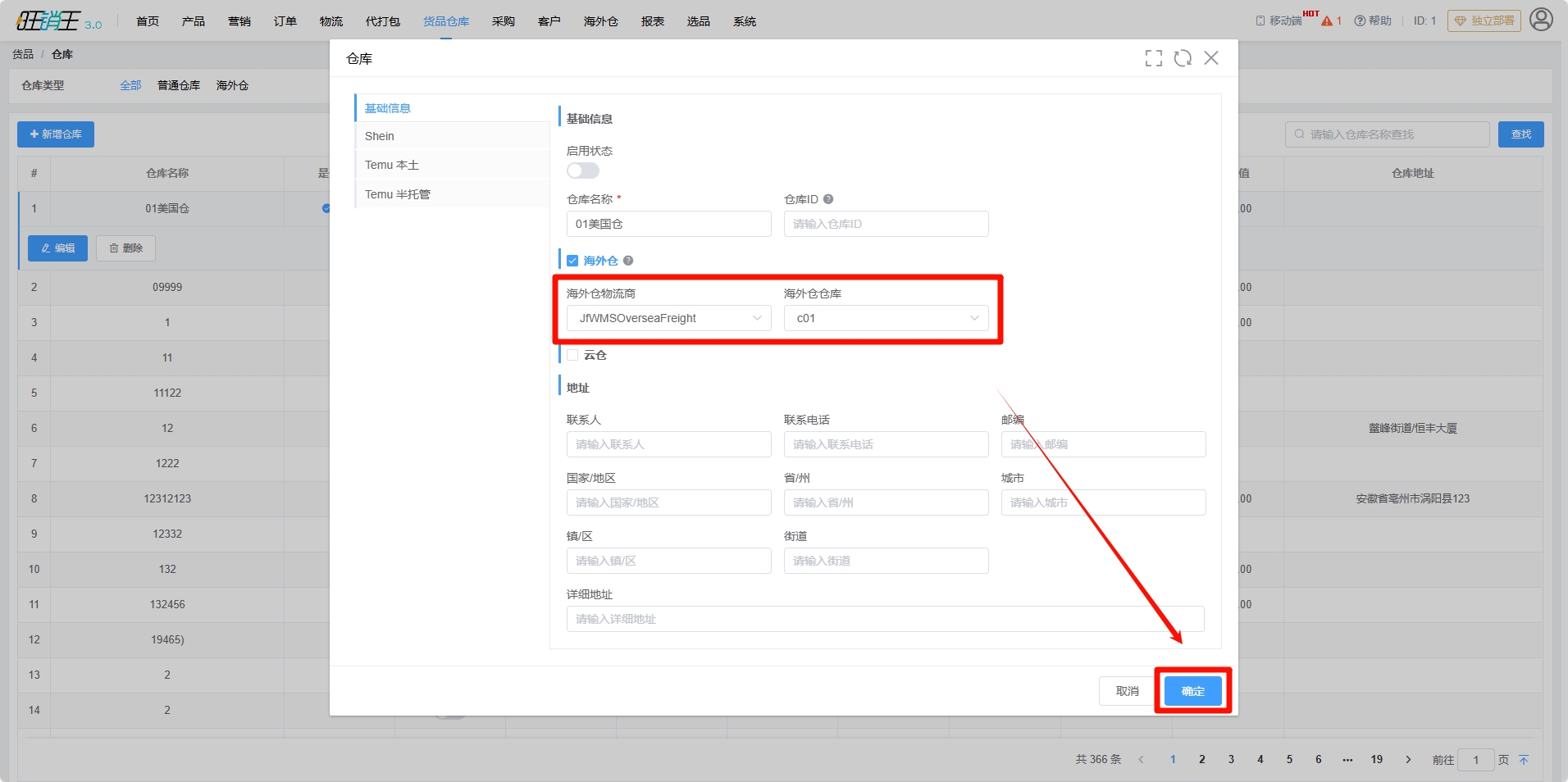 第二步:选择对应海外仓仓库开启 -> 点击确定