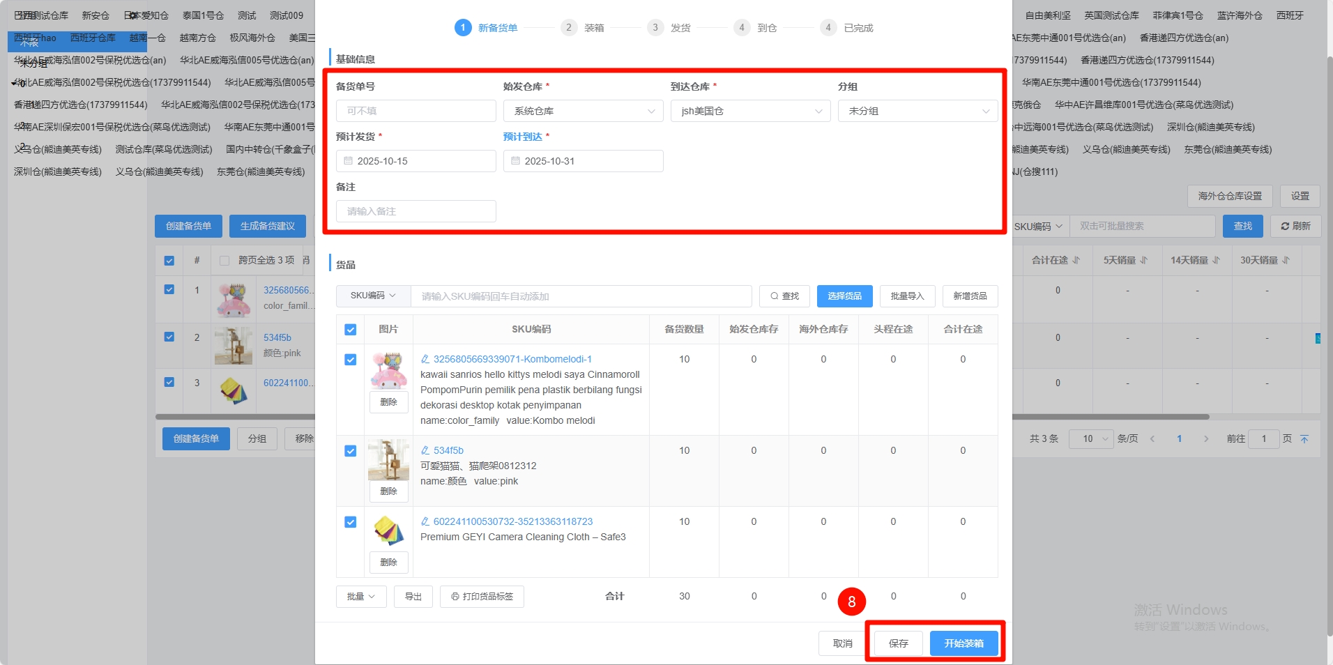 第八步:填写对应信息 -> 若各位商家还需要修改数据如实际库存等可点击保存,进入下一步需点击开始装箱