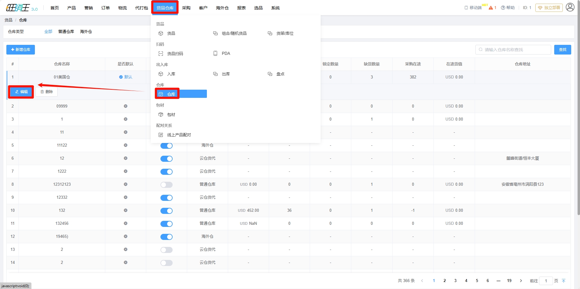 各位商家也可以点击货品仓库 -> 点击仓库 -> 找到对应仓库点击编辑