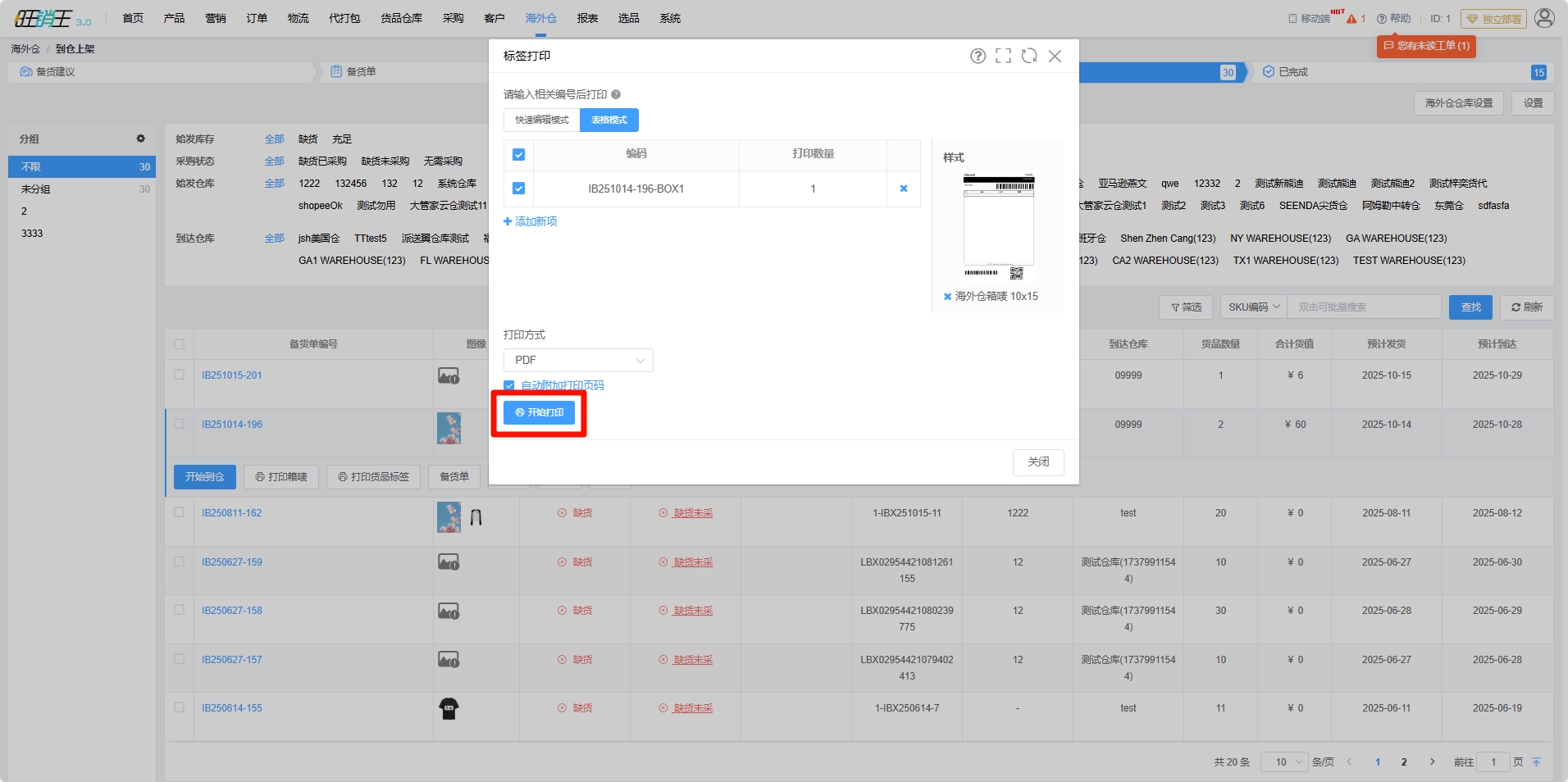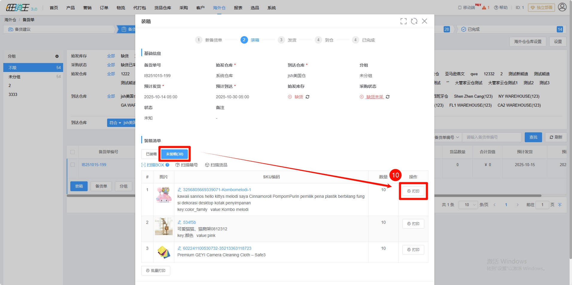 第十步:点击未装箱 -> 找到需要打印标签的货品 -> 点击打印