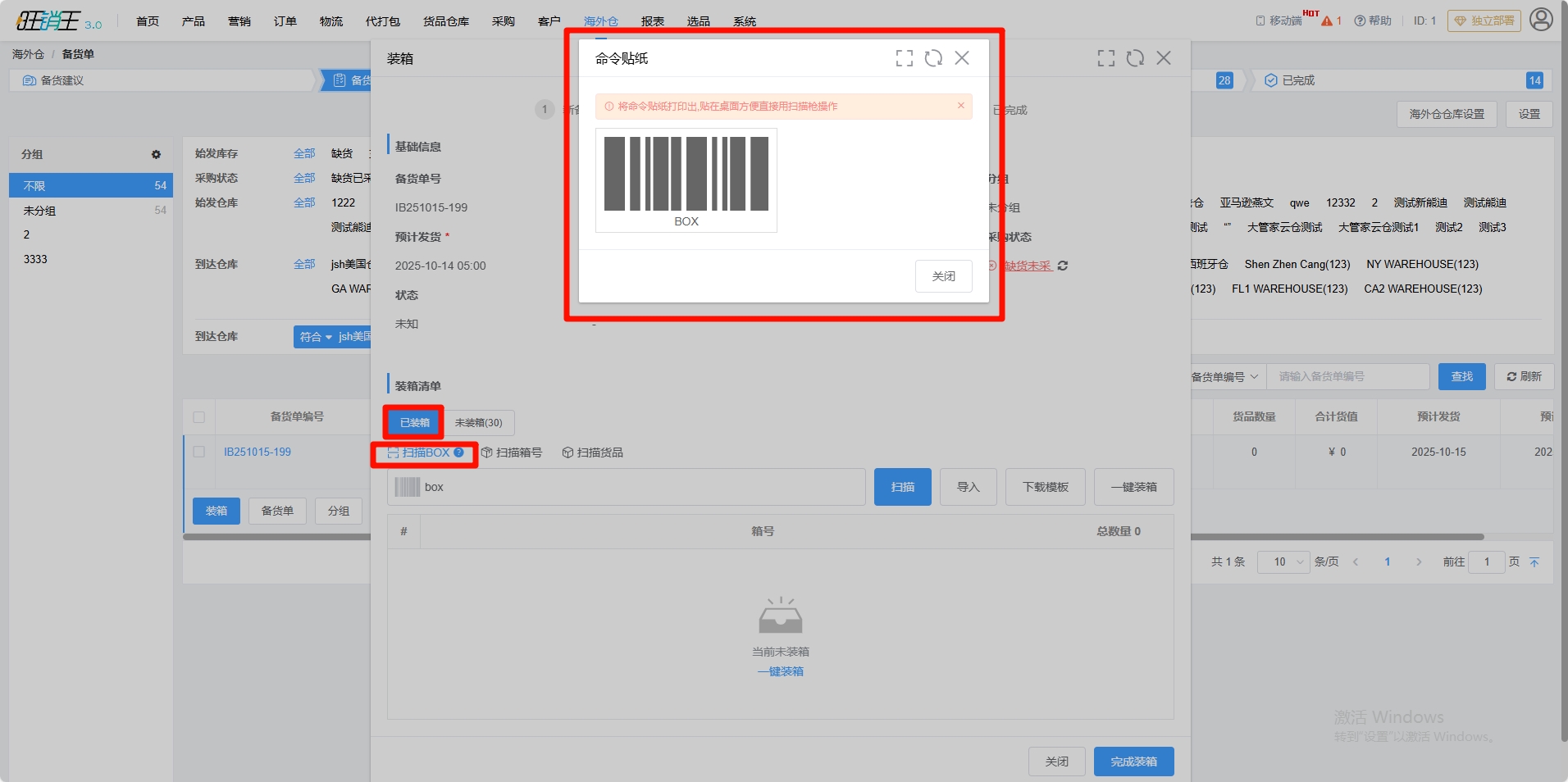 将打印好的标签进行贴标后,点击已装箱 -> 点击扫描BOX,在装箱前需扫描该箱子的条码