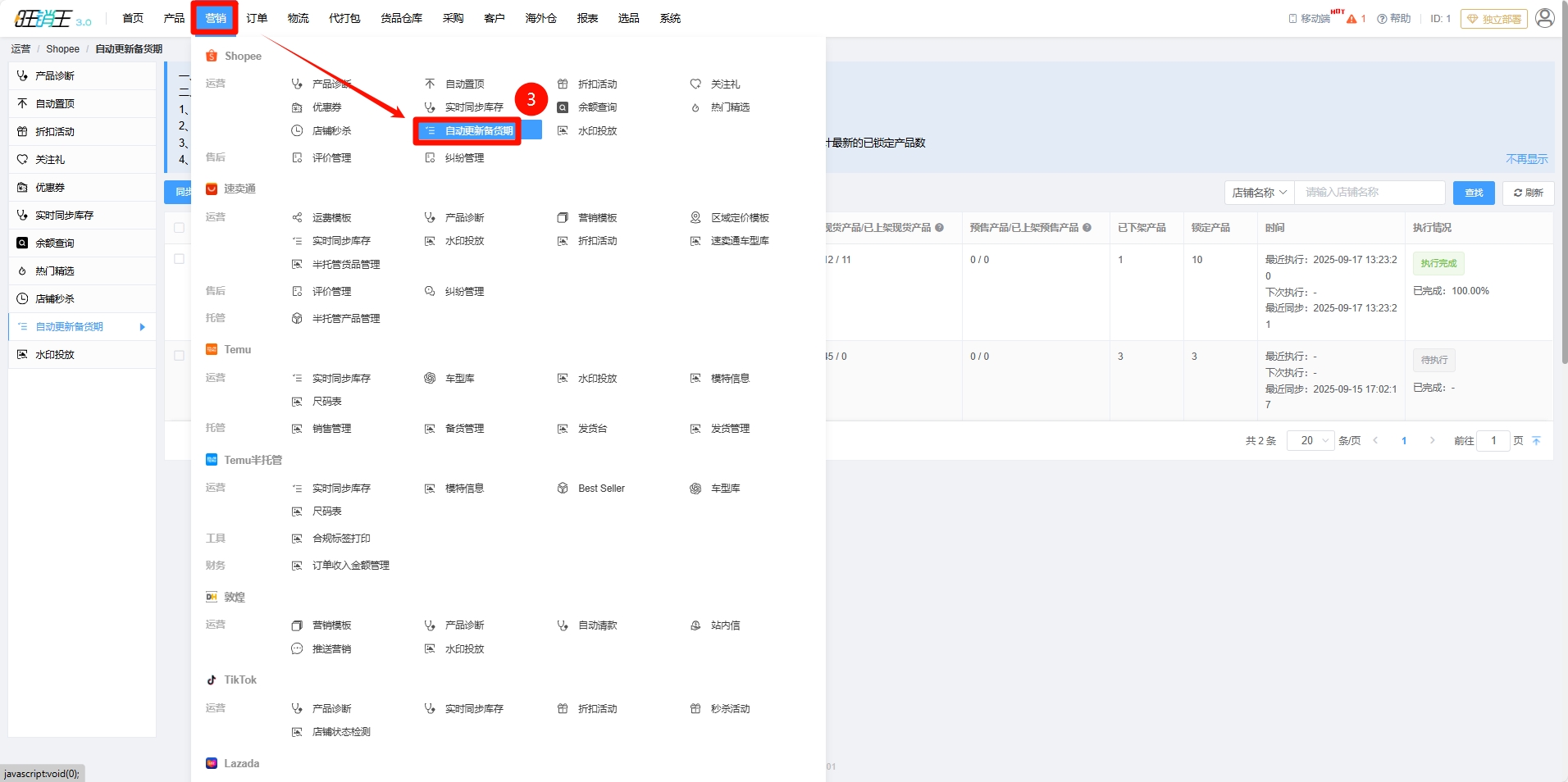 第三步:点击营销 -> 找到Shopee -> 选择自动更新备货期