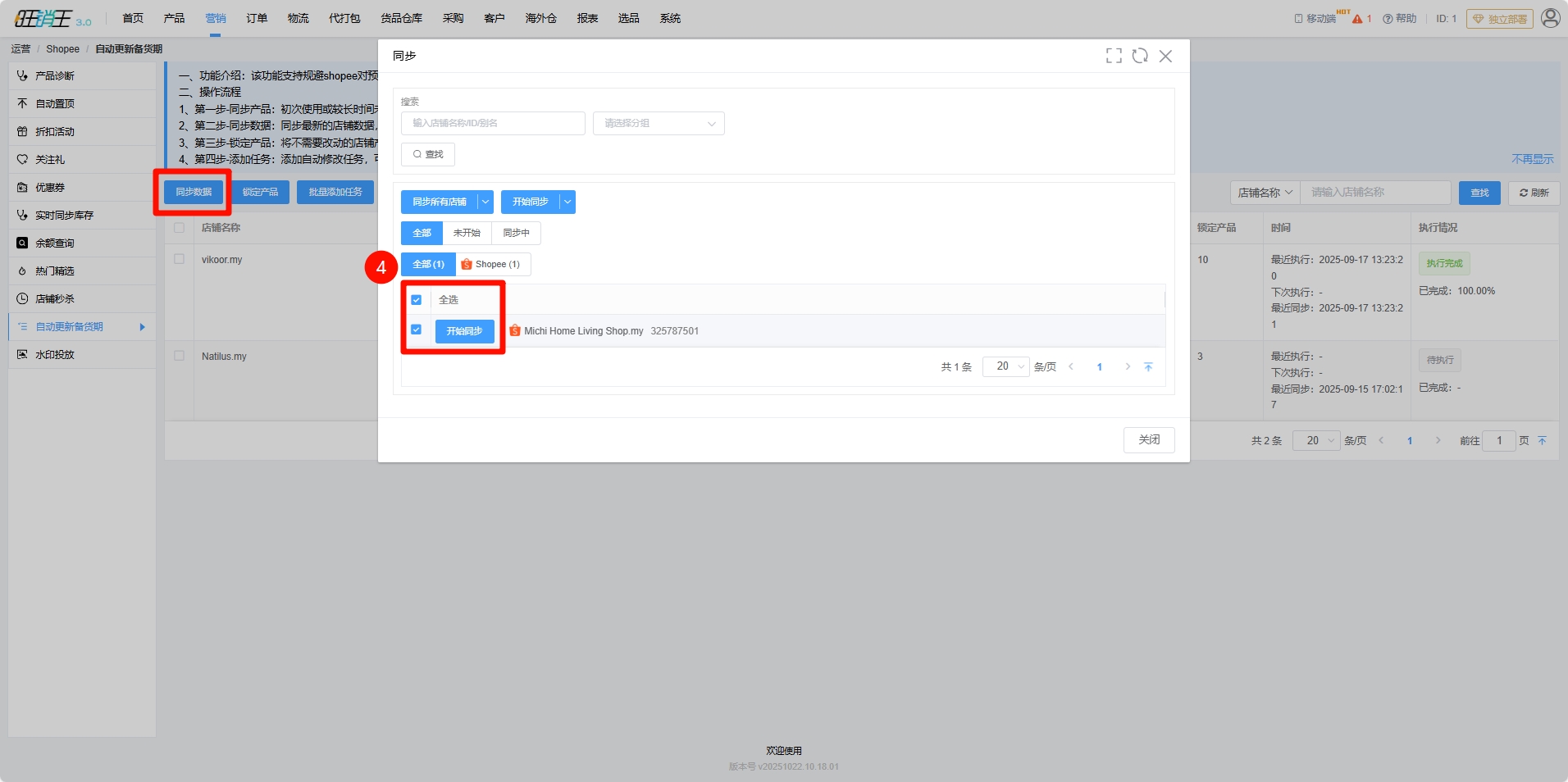 第四步:点击同步数据 -> 选择需要自动更新备货期的店铺 -> 点击开始同步