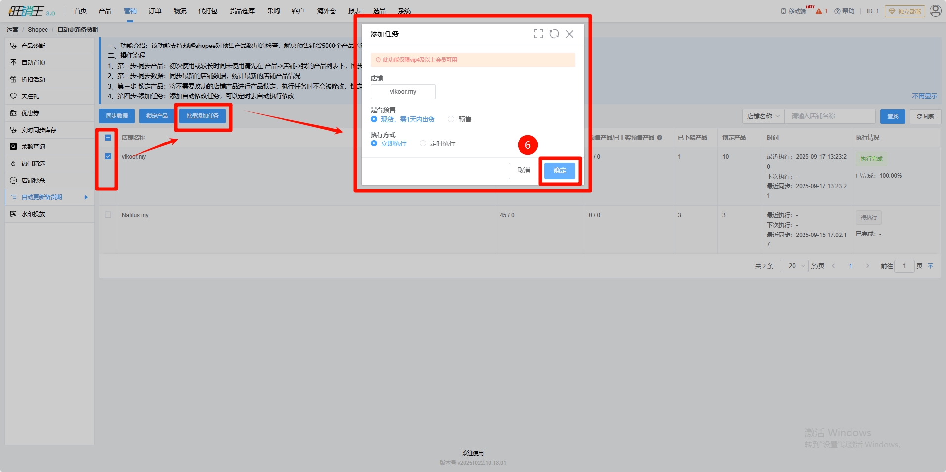 第六步:选择对应店铺 -> 点击批量添加任务 -> 选择是否预售以及执行方式 -> 点击确定