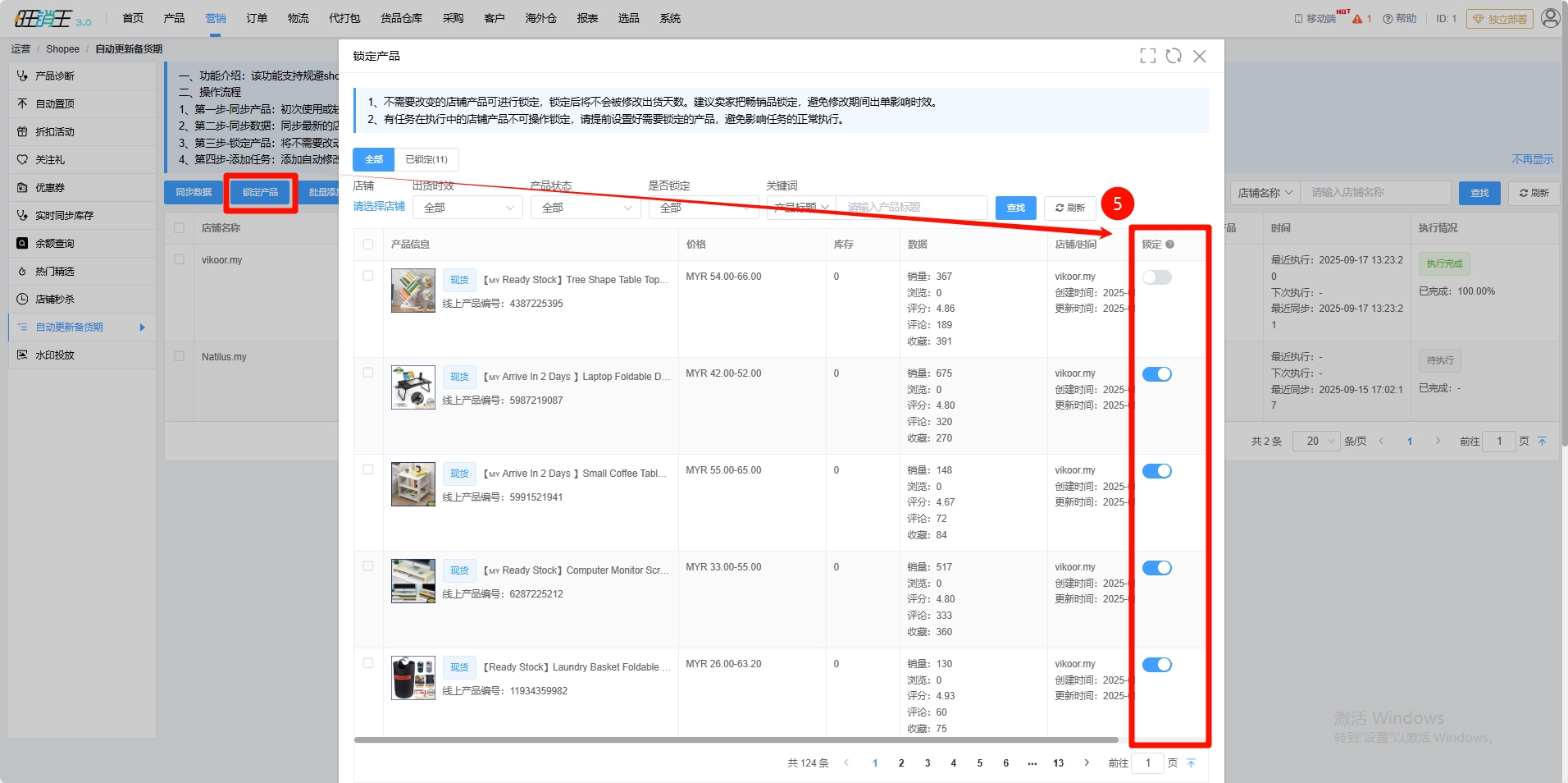第五步:点击锁定产品 -> 选择不需要进行改变的店铺产品 -> 将锁定开启