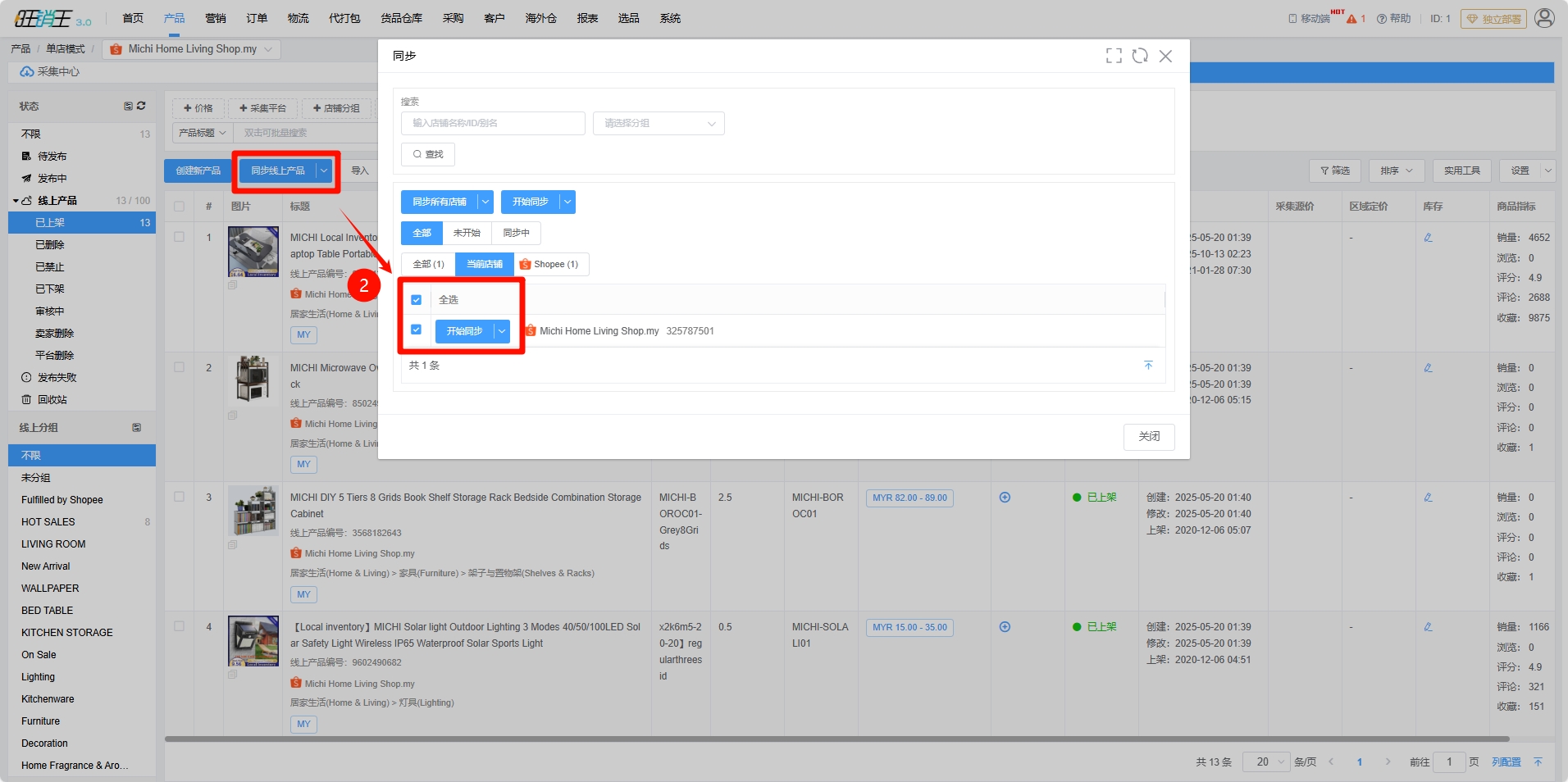 第二步:点击同步线上产品 -> 选择需要自动更新备货期的店铺进行产品同步