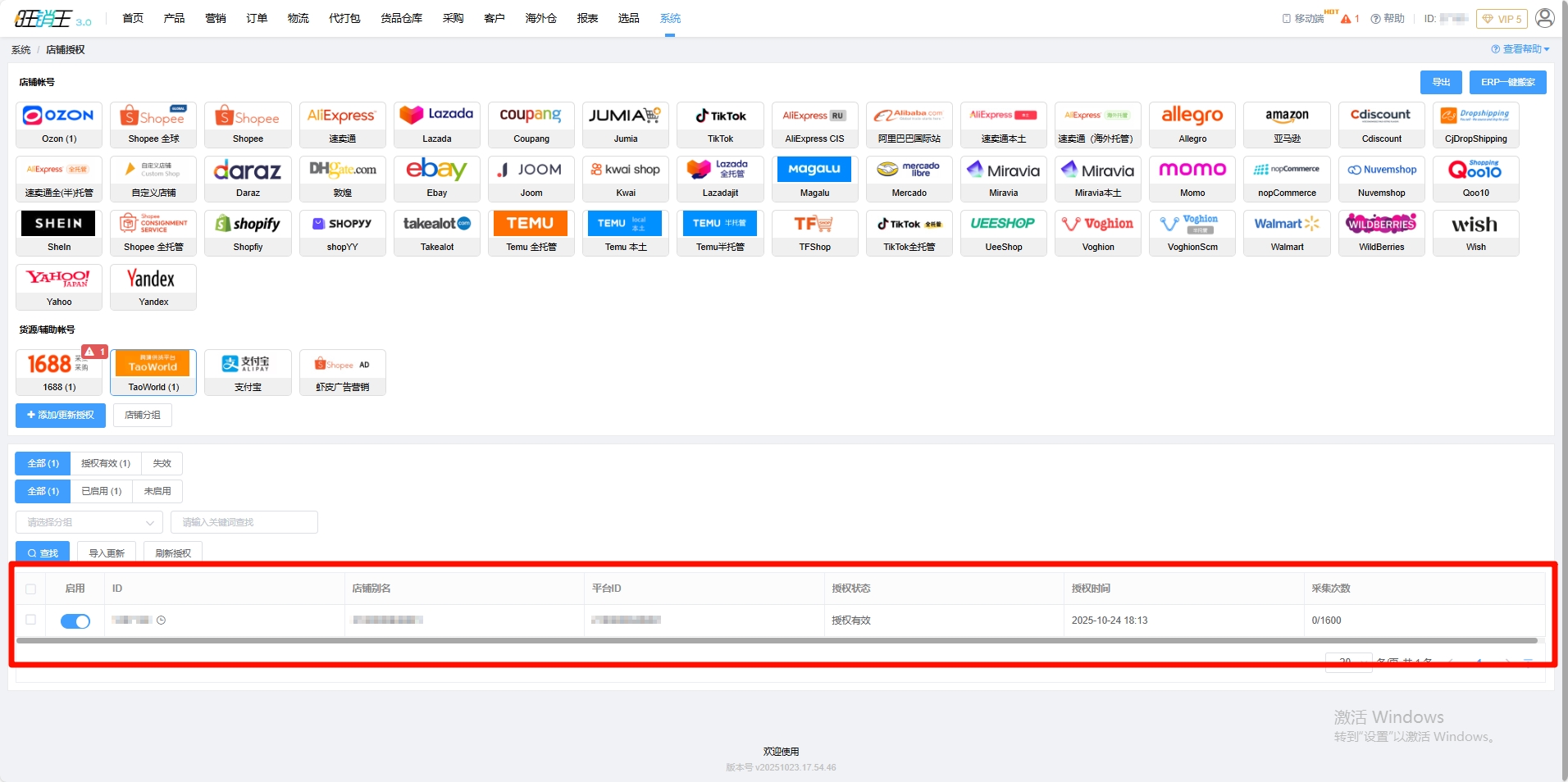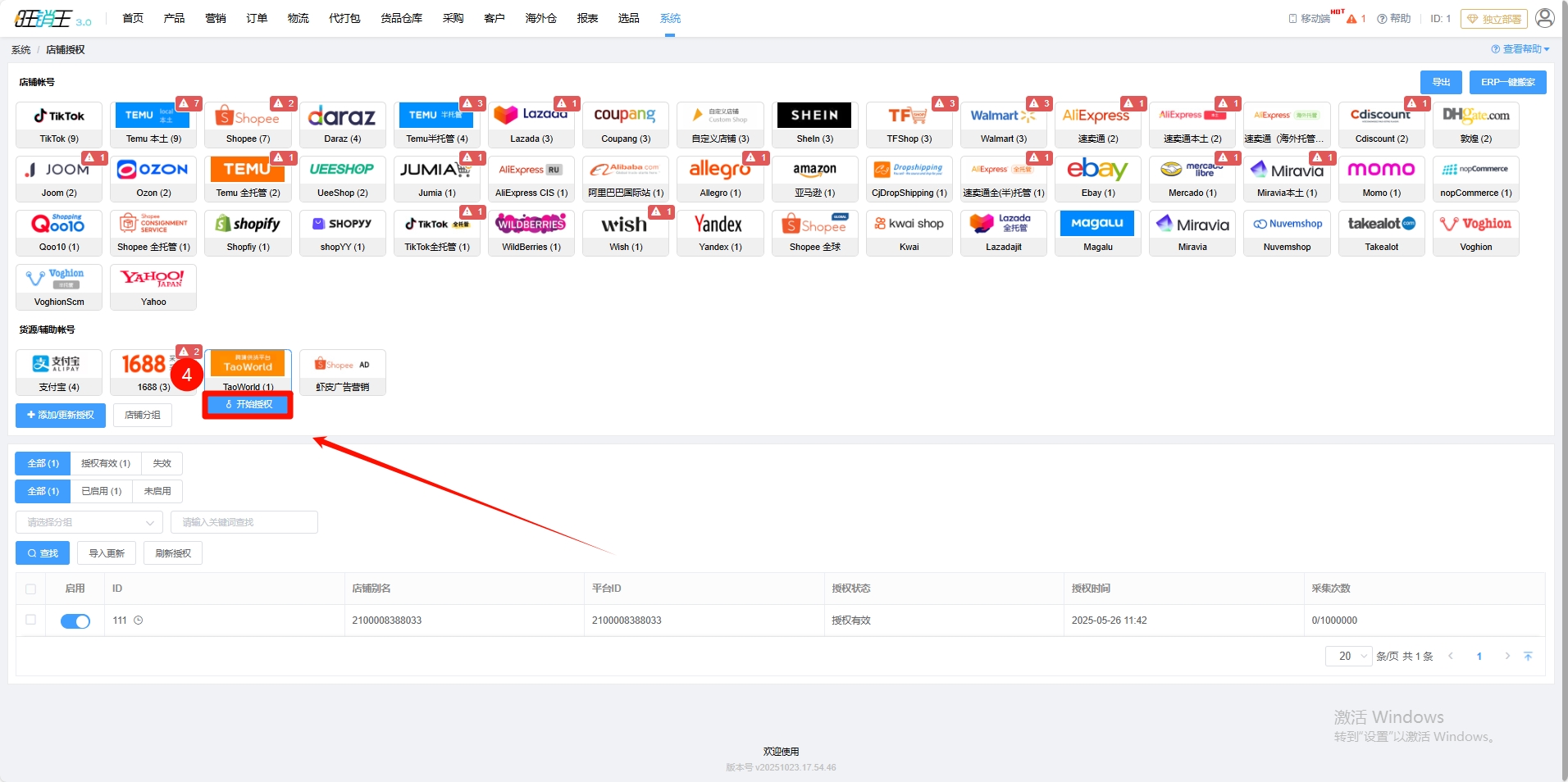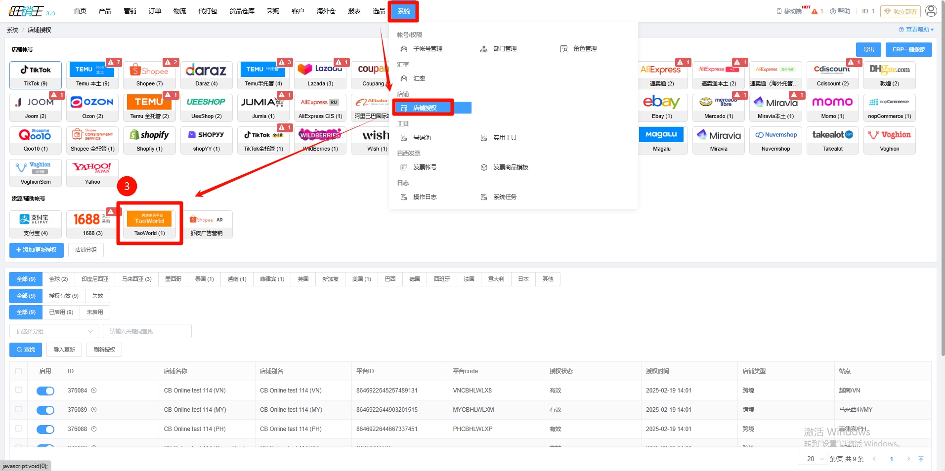 第三步:进入旺销王ERP -> 点击系统 -> 进入系统授权 -> 找到TaoWorld