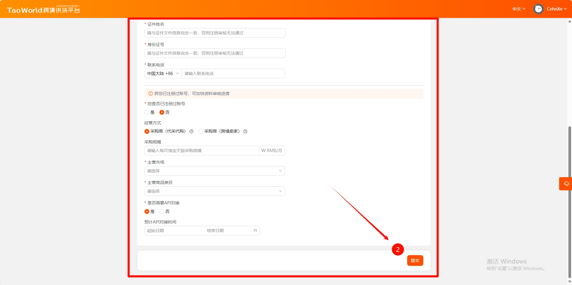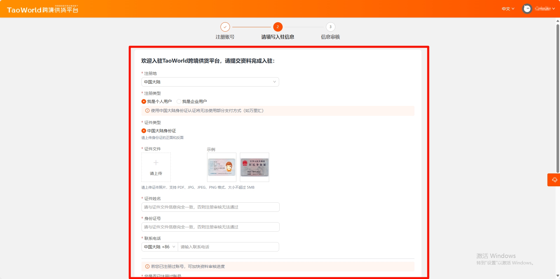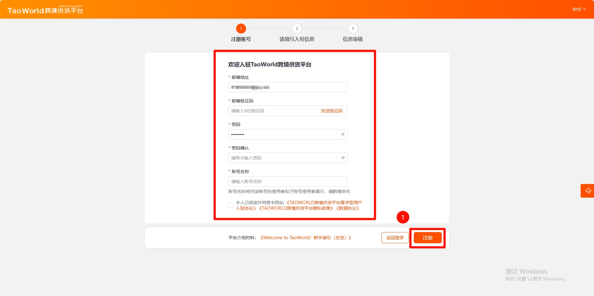 第一步:注册帐号,点击链接即可快速跳转至注册界面。 填写相关信息后点击右下角注册(TaoWorld跨境供货平台)