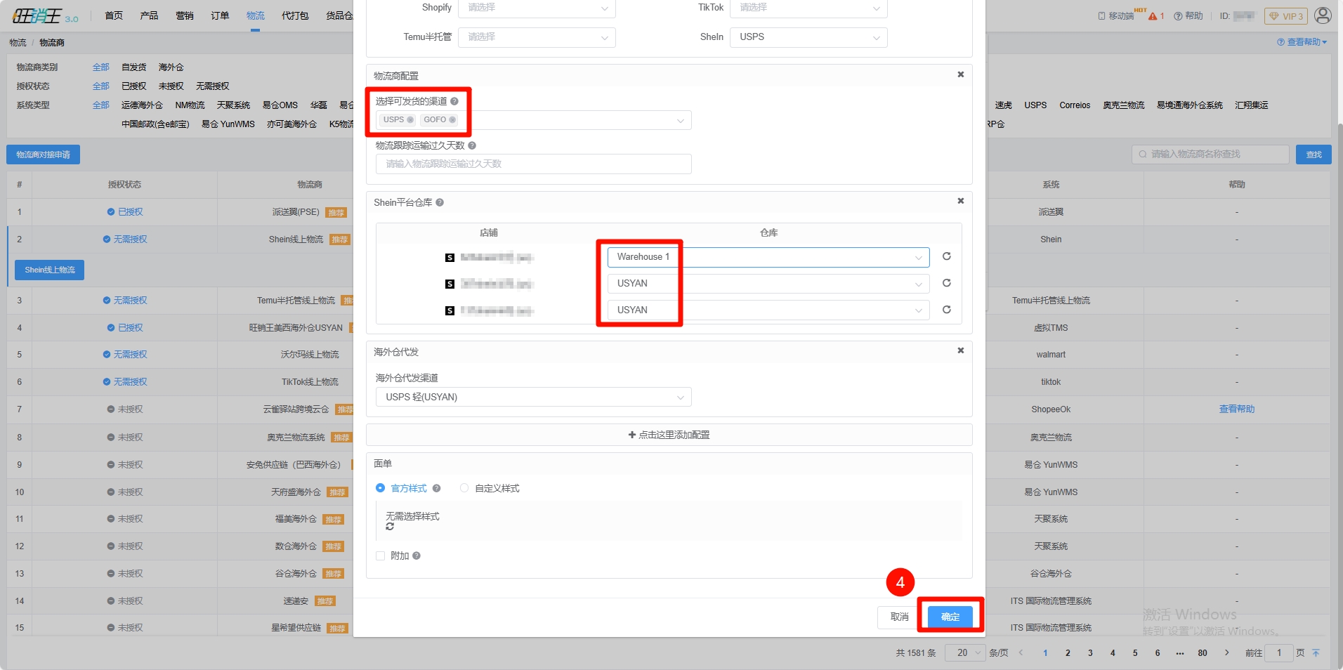 第四步:选择多个金额发货的渠道 -> 配置店铺对应的平台仓库 -> 点击右下角确定
