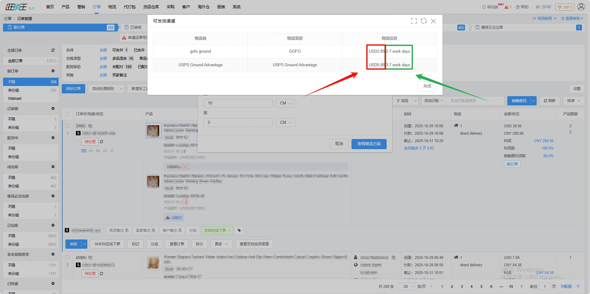左侧红色框选为预计运费(预计运费的计算根据上一步填写的长宽高重量进行计算)绿色框选为预计运输天数