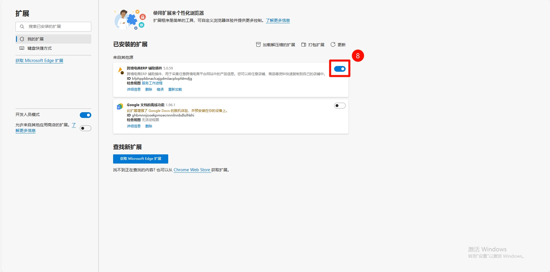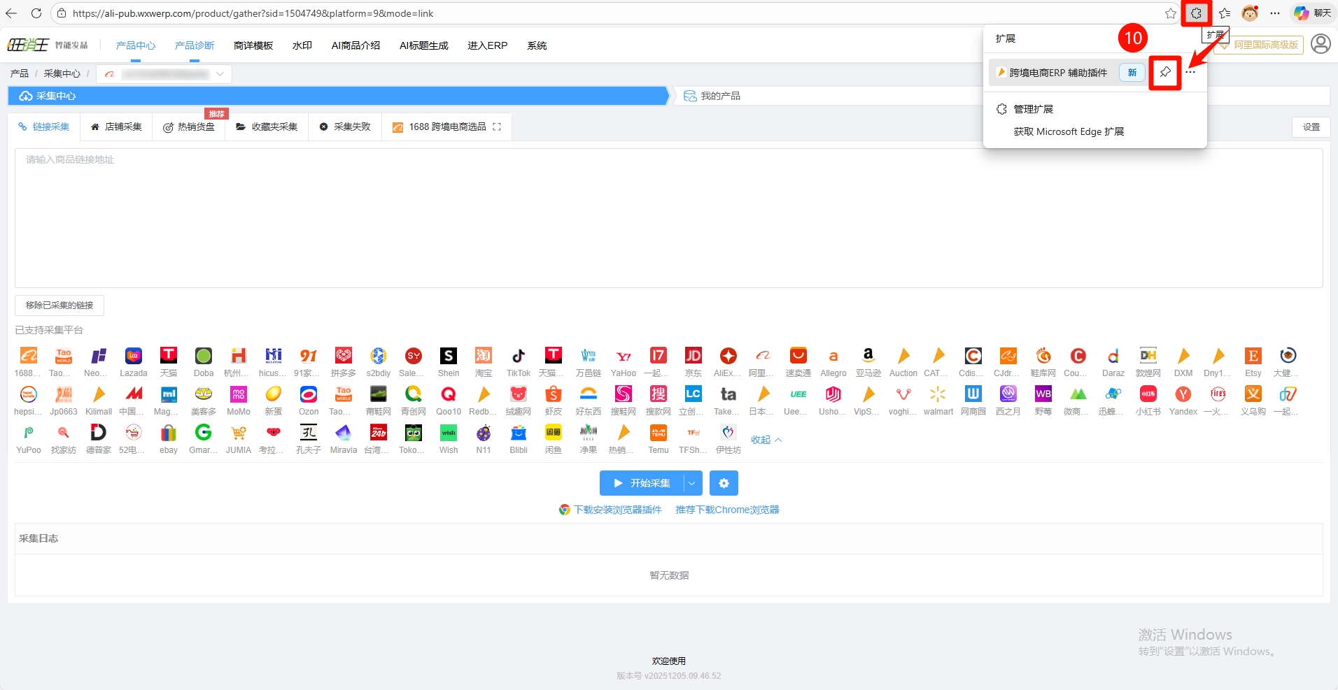 第十步:点击拓展 -> 找到旺销王ERP -> 点击固定到工具栏